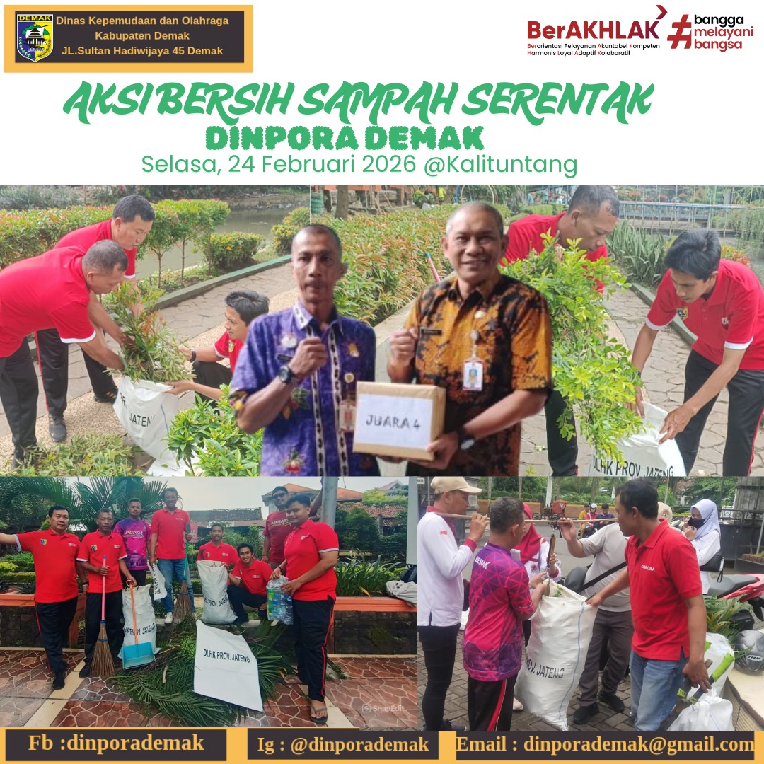 Dinas Kepemudaan dan Olahraga Kabupaten Demak melaksanakan Aksi Bersih Sampah Serentak sesuai dengan surat resmi dari Sekretariat Daerah Kabupaten Demak nomor 660.1 / 0294 perihal Undangan kerja bakti (korvei) dan dialog virtual dengan Gubernur Jawa Tengah yang dilaksanakan di Area Taman Kali Tuntang. Selasa (24/02.26).
